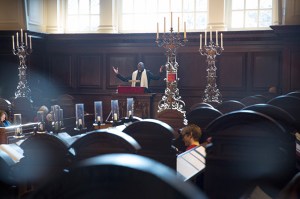 In recognition of the Boston Marathon bombings and as part of One Boston Day, Harvard police officer and affiliated minister Kevin Bryant offered hope to the community during the University’s Morning Prayers service at Memorial Church’s Appleton Chapel.