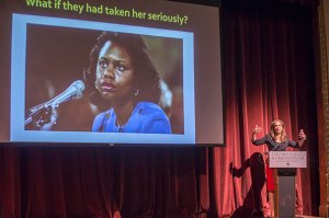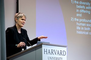 Diane Moore, director of the Religious Literacy Project at Harvard Divinity School, used Harvard’s Memorial Church as a focal point in kicking off her discussion on religion. Moore spoke as part of the Harvard Ed Portal’s faculty series.