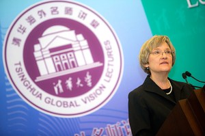 Harvard President Drew Faust tells an audience at Tsinghua University in Beijing that universities have a unique and critical role to play in combatting climate change.