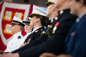 A Tercentenary Theatre ceremony launches seven ROTC graduates as officers in Marines, Navy, and Air Force.