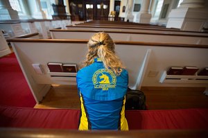At the Memorial Church on Tuesday, runners, students, and others paid their respects on the anniversary of the Boston Marathon bombings.