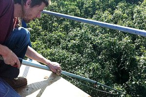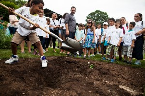 Mexican artist Pedro Reyes visited the Arnold Arboretum to plant a hydrangea — using a shovel made from the metal of surrendered firearms — as part of his Palas por Pistolas (Shovels for Guns) program.