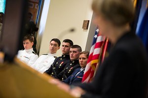 Four men and one woman from Harvard’s Class of 2013 received their military commissions during a ceremony Wednesday attended by Harvard President Drew Faust.