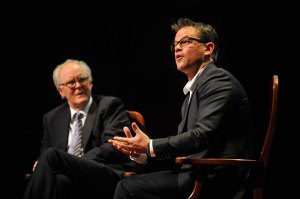 Actors Matt Damon and John Lithgow met at Sanders Theatre on Thursday for a spirited conversation that kicked off Harvard’s annual Arts First celebration.