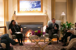 Twenty students who were chosen by lottery to join Professor Matthew Nock and Harvard College Dean Evelynn M. Hammonds at her house for a “fireside chat.” The event was the second in a new series meant to connect undergraduates with faculty members in an open, informal, and welcoming atmosphere.