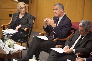 During Washington visit, Harvard President Drew Faust tells business, policy, and diplomatic leaders that they should maintain a strong research partnership between the federal government and higher educational institutions.