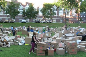 Arriving Harvard students helped to build the world’s largest cardboard box fort in the MAC Quad.