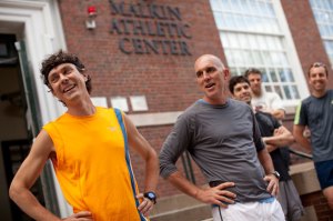 Nearly 80 runners gathered at the Malkin Athletic Center for a celebratory jog along the Charles River with authors and fitness authorities Scott Jurek and Christopher McDougall.