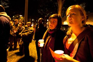 More than 50 students, faculty members, and administrators gathered Wednesday night to commemorate National Coming Out Day and to memorialize the BGLTQ students nationwide who committed suicide in recent years following harassment.