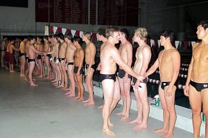 It is 20 minutes before midnight on a balmy September night. Thirty-seven Harvard varsity swimmers and divers stand in a circle on a shadowy brick patio outside Blodgett Pool. The men are milling, joshing, and preparing mentally for the 12:01 a.m. arrival of the competitive swimming season in the Ivy League. Oct. 1 is upon…