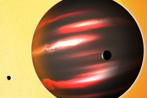Imagine a giant world like Jupiter, but more alien than any planet in our solar system. Instead of displaying gleaming clouds colored white and salmon, this world is darker than the blackest lump of coal. It glows only with a feeble red light like a stove’s electric burner — the result of scorching heat from…