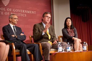 Former Washington, D.C., chancellor of schools Michelle Rhee, former Florida governor and current visiting fellow Jeb Bush, and the Center for American Progress’ John Podesta tackled the politics of education reform at an Institute of Politics forum moderated by former U.S. Secretary of Education Margaret Spellings.