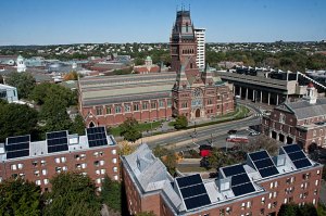 New solar panels atop Canaday Hall, a freshman dormitory, are part of a heat-recovery project that’s expected to supply at least 60 percent of the hot water for buildings in Harvard Yard.