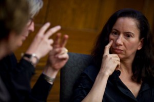 Performance artist Andrea Fraser discussed some of the inspiration behind her work and her current installation on view at Harvard’s Carpenter Center for the Visual Arts, during a discussion at Harvard’s Barker Center.
