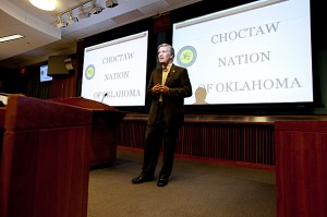 Leader of the Choctaw Nation visits Harvard classroom to discuss how he helped the Indian tribe to reorganize and solve many of its own problems.