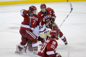 The Harvard Crimson men’s hockey team faced Northeastern in the Beanpot consolation game on Feb. 9, but couldn’t avoid the Huskies’ bite, losing 4-1.