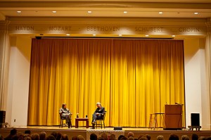 Harvard Law School Professor Lawrence Lessig spoke before a Harvard Alumni Association audience about institutional ethics and alumna Linda Greenhouse interviewed President Faust about Harvard’s future during a Paine Hall event.
