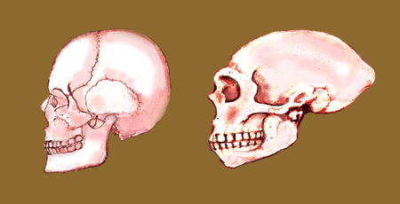 According to him, a sharper downward bend in the platform at a position near the temples makes modern skulls rounder than those of Neandertals and more ancient species. The flexion, which coincided with a forward extension of the cranial base, also moved faces under the front part of the brain and eliminated heavy brow ridges.