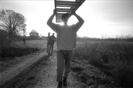By midweek, skills solidify and teams gel into graceful building operations. Nell Brennan ’02, who nearly bored into her thigh the first day when she slipped her drill into her overall loop, confidently pops screws into Sheetrock with one-handed jabs.