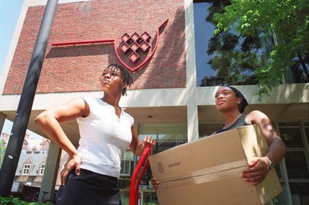 Taking a break during a day of exams and packing are next-year-suitemates, sophomores Alyssa Smith (left), Rachel Stein, and Ellen Lee. Claire Summers ’03 (left), gracefully poised with her dolly, and Monique James ’03, easily hefting a packing box, both appear to be looking forward to the summer. Above, Reggie Lee ’03 (right) uses his head as he helps buddy Jeffrey Muns ’03 move a futon into Quincy House for summer storage.<br /> At left, graduating senior Katie Heller and friend Susan McGregor ’05 bid a sad goodbye in the Yard.</p>