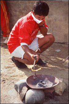 It’s a common sight to see Indian women, with children on their backs, or together in a small hut, heating the silver-colored, gold-flecked amalgam balls in metal pots. The heat vaporizes the mercury, leaving a pot of pure gold worth about $100 to impoverished families. The process also leaves mercury vapors that are inhaled by the children.