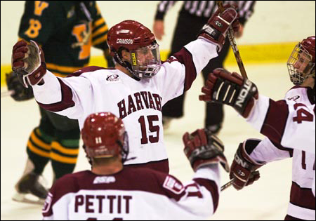 Amidst a four-game non-losing streak (three wins and one tie since Feb. 21), the Harvard men’s hockey team (21-8-2) picked up two of its biggest victories of the season this past weekend with a two-game sweep of Vermont in the best-of-three ECAC quarterfinals. With the wins, a 4-2 decision on Friday (March 14) and a 5-1 conquest on Saturday (March 15), the Crimson advances to the semifinals in Albany, N.Y. where they’ll face Dartmouth on Friday (March 21). If all goes well against the Big Green, the icers will earn an automatic bid to the NCAA tournament.