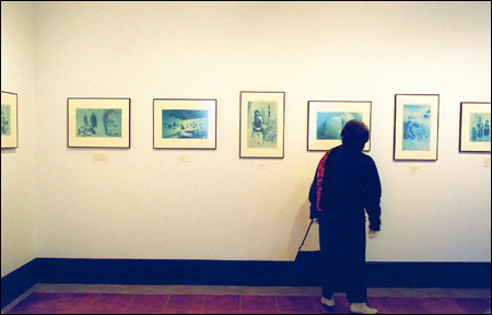 A woman looks at photographs by Charles Fletcher Lummis at the Peabody Museum. The exhibit is called ‘Southwestern Portraits, 1888-1896.’