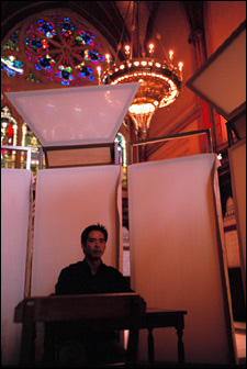 There in the light of the towering stained glass windows, amid the stone plaques commemorating Harvard’s Civil War dead, Lee has constructed a wood and canvas enclosure in which people may consult the seers.