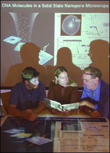 In the most recent experiments, reported in the September issue of the journal Nature Materials, Golovchenko’s team pulled strands of DNA through a nanopored sheet that separated two pools of salt water. One pool had a positive charge. The DNA and the other pool were negatively charged. “The DNA is electronically sucked through the nanopore like a piece of spaghetti,” Golovchenko explains. His research team included graduate students Derek Stein and Marc Gershow, postdoctoral fellow Jiali Li, and staff scientist Eric Brandin.
