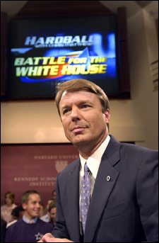 Sen. John Edwards (D-N.C.), fighting to break out of the middle of the crowded pack of Democratic presidential contenders, answered his critics Monday night (Oct. 13) during the first in a series of one-on-one interviews with the candidates at Harvard’s Kennedy School of Government. The program was televised live from the John F. Kennedy Jr. Forum on MSNBC’s “Hardball With Chris Matthews.” Matthews conducted the interview.