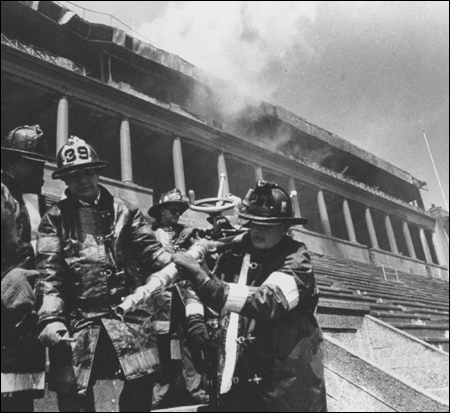 A lighted cigarette starts a blaze that consumes the stadium’s press box. The press box – “one of the best in the country” according to the Harvard Crimson – suffered $20,000 in damages.