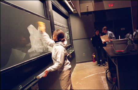 In the prep room behind the blackboards of the Science Center’s five lecture halls, excitement crackles in the air as 11 o’clock approaches. Members of the media services and lecture demonstrations staffs stand at the ready with computers, buckets of soapy water, a bicycle wheel, and a bed of nails. As the top of the hour hits and classes end, they swoop into the halls for their hourly seven-minute window to strike the last professor’s lecture needs and ready the next class for optimal learning.