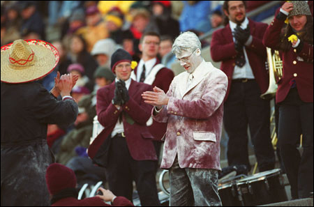 Harvard Band manager Dave Nierenberg ’04 was showered with flour after showering his fellow band members with real flowers, as is the tradition at the Penn game. Harvard lost, 32-24.