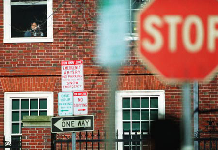 First-year Riya Sen studies for her government class in her dorm room while listening to music and looking out at bustling Massachusetts Avenue.