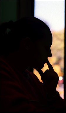 Against a backdrop of afternoon sun, GSE doctoral student Kathleen Moran studies at Gutman Library.