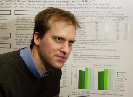 Tobias Pischon, a research associate at the Harvard School of Public Health, said the study showed that people who drank moderate levels of alcohol had the highest levels of adiponectin.