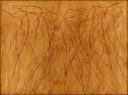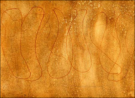 The pieces themselves are small, modest, quiet, uninsistent. A few might be mistaken for half-conscious doodling, others for sections of wrapping paper designed for some particularly somber holiday, others for samples of faux sandstone or cherry veneer. But it is their very modesty that forces the viewer to come in close and contemplate the calligraphic pen strokes, the overlapping layers of ink wash, the mysterious slashes and indentations that show faintly through coatings of dark paint.