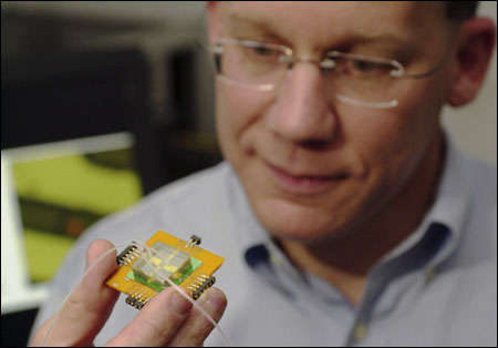 In his office, Lieber shows visitors a two-inch-square silicon and metal chip containg an array of nanowires and two pinhead-size entry ports through which blood, saliva, or other bodily fluids can enter. Air samples put into a fluid solution would also be tested this way.