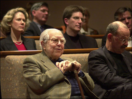 Carter, who earned an A.B. degree from Harvard in 1930 and an M.A. in 1932, sat with admirable equanimity and occasional flashes of enjoyment through the entire three-hour program. A short, nattily dressed gentleman with a Dickensian paunch, thick white hair, and a beaming face, he descended the steps of the small amphitheater with the aid of a cane, an elegantly carved wooden model. Before the start of the proceedings, he rose from his seat, made his way to the rostrum, and delivered some short remarks in a strong, unamplified voice.