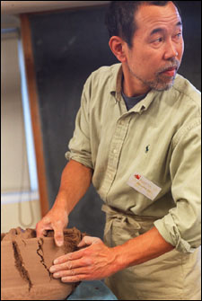 Last Friday afternoon (Nov. 5), the winds off the Charles River sent swarms of leaves swirling by the windows of the Ceramics Program Studio, while inside a group of about 30 people sat in tranquil silence. Some sketched or scribbled notes, some leaned forward, rapt, for a better look. The center of attention was Yo Akiyama – more specifically, his hands and the slab of clay he was working with as it spun on a potter’s wheel. With the nimble fingers of a masseur and a concentrated gaze, he manipulated the clay until its shape bore a vague resemblance to a lamp shade.