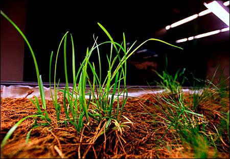 A series of tables, illuminated by grow lights, contain live examples of the grasses used to reclaim these devastated Western landscapes. The grasses – hardy species such as Nebraska sedge and hardstem bulrush – are grown on netting made from coconut husks, which biodegrades as the grasses take hold. Known as prevegetated coir sod, the material can be ordered by the square yard and shipped to a site for planting.