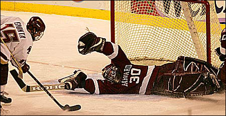 Crimson goalie Dov Grumet-Morris ’05 makes a diving save on a shot by B.C.’s Stephen Gionta in the consolation Beanpot game at the FleetCenter on Feb. 14. The Eagles beat the Crimson, 4-1.