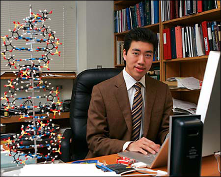 Newly named Howard Hughes Medical Institute investigator David Liu harnesses biomolecules such as DNA to guide synthesis of compounds to study chemical reactions and the machinery of life. (Photos by Robert Klein/AP © 2005 HHMI)