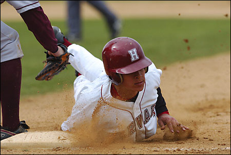Against the Bulldogs on Saturday (April 16), the home team opened the series with a 4-0 shutout. Frank Herrmann ’06 pitched a complete game two-hitter for Harvard, striking out seven batters. In game two, catcher Schuyler Mann ’05 hit a grand slam in the bottom of the eighth to tie things at 5-5 before crushing a game-winning double.