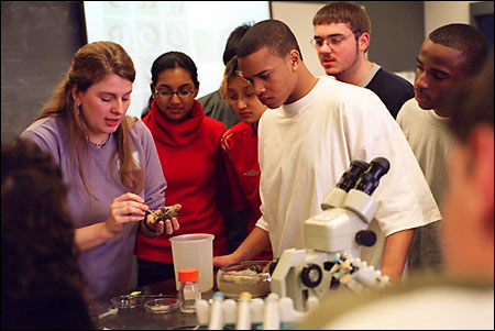 Jacqueline Brooks, a postdoc research associate in the Department of Molecular and Cellular Biology (MCB), doesn’t seem to notice the too-cool attitude that drifted in with the baggies and low-rise jeans. “They look enthusiastic!” she says perkily.