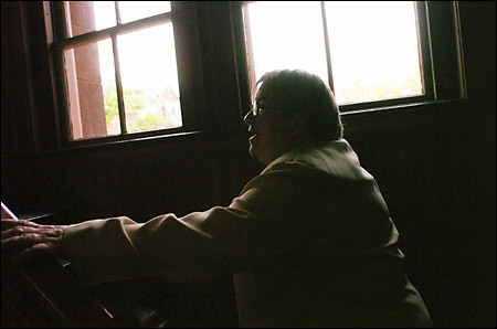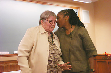 Convicted of conspiracy and facing up to 40 years in prison, activist attorney Lynne Stewart visits the Law School, where she presents a spirited self-defense. (Staff photos Kris Snibbe/Harvard News Office)