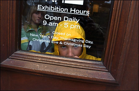 While waiting to take a tour, 8-year-old Brian Mareau of Salem, N.H., peers out the door of the Harvard Museum of Natural History at the rain coming down.