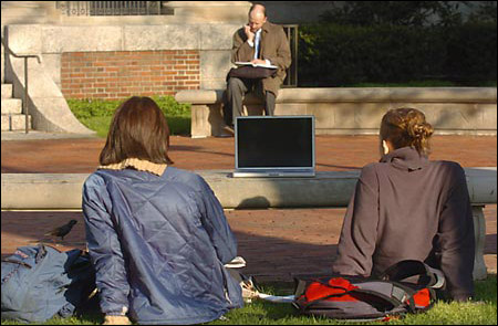 On a sunny day before the floods of May, a couple of students take a TV kind of attitude to their laptop, while in the background sits a member of that disappearing species, the reader.