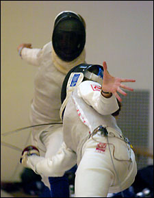 Current junior world champion and Harvard foilist Emily Cross ’08 (left) conveys much emotion after scoring a touch against Brandeis’ Tess Woehrlen. Men’s foilist Sam Cross ’09 (right, background) attempts to score on a counterattack with a flick after his Brandeis opponent falls short.