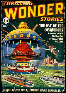 The magazine covers – the only part of the publication in color – have their own eye-catching appeal, and some were created by the great American illustrators of the time, like Frank R. Paul and Earle K. Bergey. The covers are noteworthy for their “fantastic realism,” said Scott. “You don’t have models for space aliens. We’re not talking Rembrandt or Vermeer, but we’re talking about artists who gave visual terms to almost otherwise unthinkable visions.”